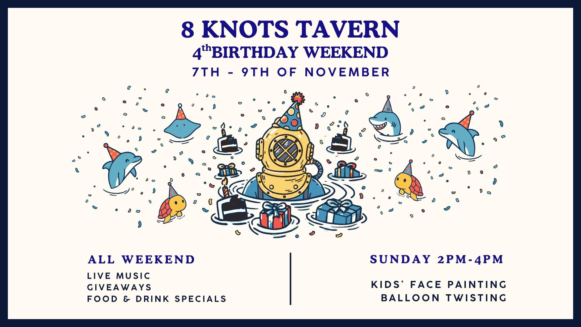 Join us for a massive birthday weekend at 8 Knots, packed with live tunes, giveaways, food & drink specials, and good times all round 🍻
